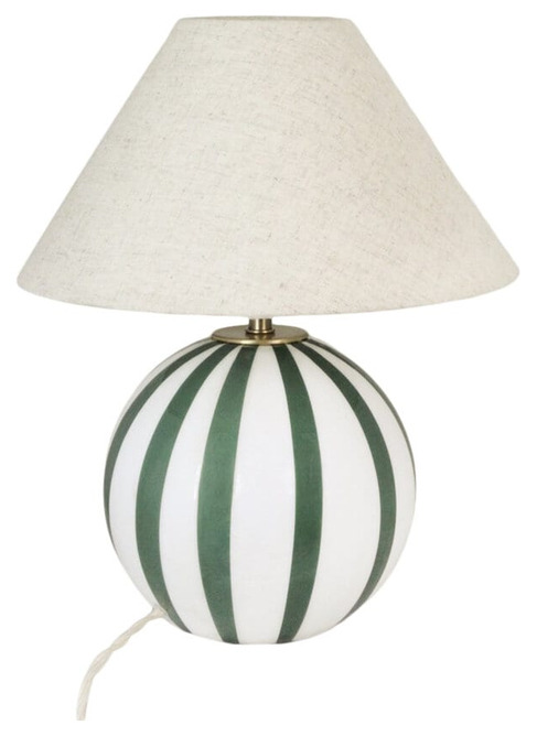 En elegant bordslampa med rund fot i munblåst glas, där den mjuka gröna tonen mjukt smälter samman med en vit bas. Varje lampa är unik – små skiftningar i färg och tunna "blixtar" i glaset uppstår naturligt i tillverkningsprocessen och ger ett charmigt, levande uttryck.