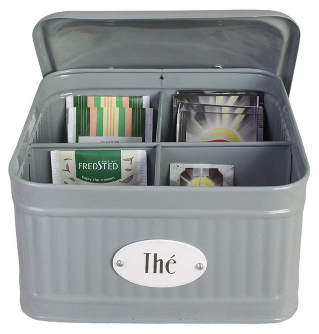 En stilfull och nostalgisk teburk i grön plåt med matchande lock och vitt handtag. Den har fyra fack som gör det enkelt att hålla ordning på dina favoritsmaker. Den franska texten Thé på framsidan ger en lantlig känsla som passar perfekt i både moderna och klassiska kök. Perfekt för att duka upp till en riktigt trivsam tebjudning.