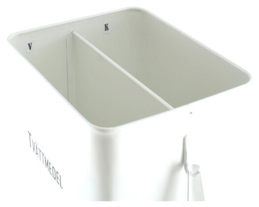 Plåtburken har en rektangulär form med släta kanter och hörn, vilket ger en mjuk känsla trots dess robusta struktur. Inuti burken finns en praktisk avdelare som delar utrymmet i två sektioner, märkta med bokstäverna "V" och "K". Detta arrangemang kan underlätta organisationen genom att tillåta separat förvaring av olika typer av tvättmedel eller kanske skilja mellan pulver och tabletter.