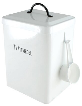 I denna plåtburk som har en skiljevägg kan du förvara både tvättmedel för vit tvätt samt färgad tvätt. Medföljer en skopa för enkel dosering. Mått: 18,5 x 15,5 x 24,5 cm.