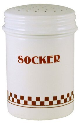 Plåtburken är cylindrisk och har en robust konstruktion som utlovar lång hållbarhet. Färgschemat består av en klassisk kombination av rött och vitt, vilket ger en retro känsla. Den vita basen bär ordet "SOCKER" skrivet i stora, röda bokstäver som tydligt indikerar dess användning. Denna textstil bidrar till den retroinspirerade designen, vilket gör den till ett estetiskt inslag i köksinredningen.