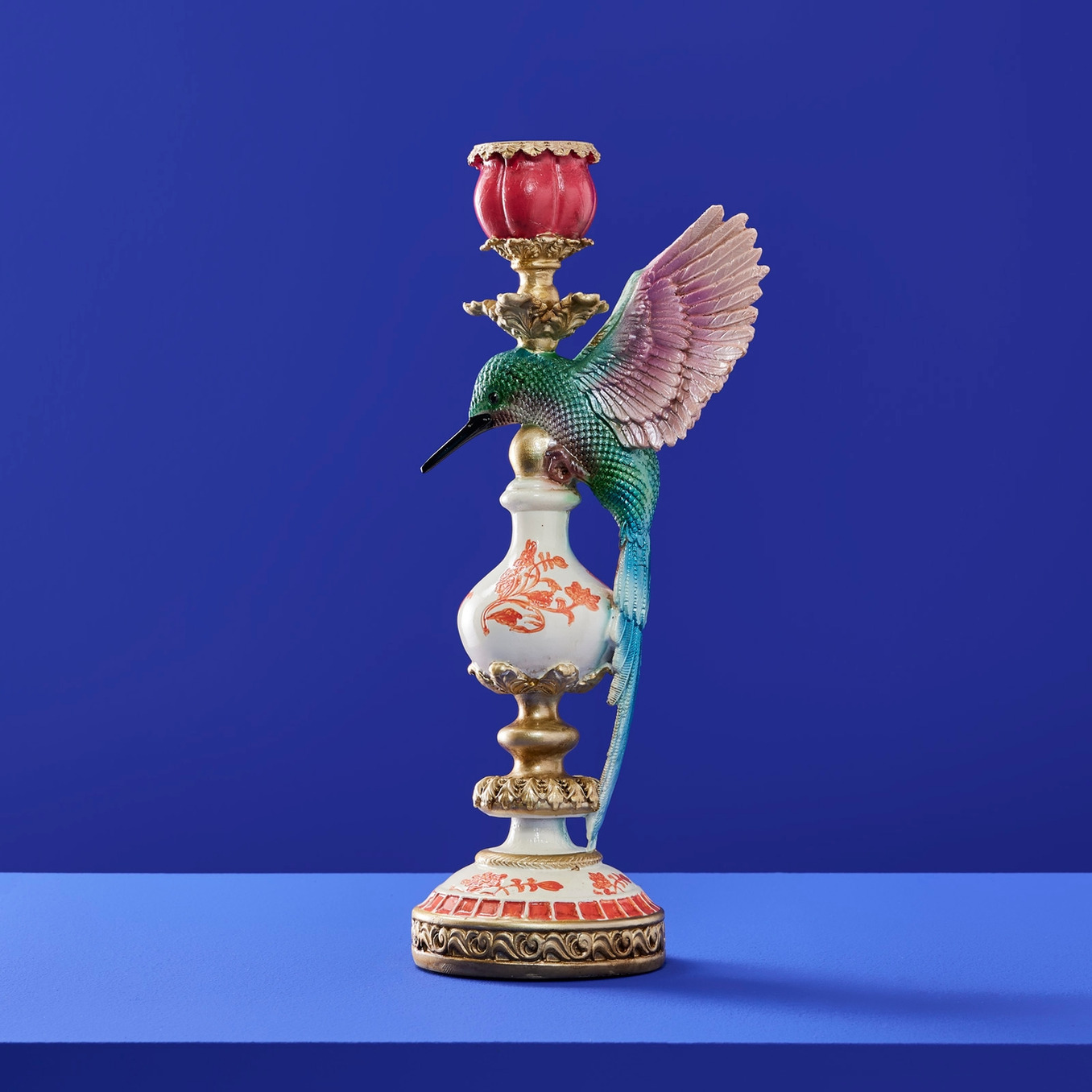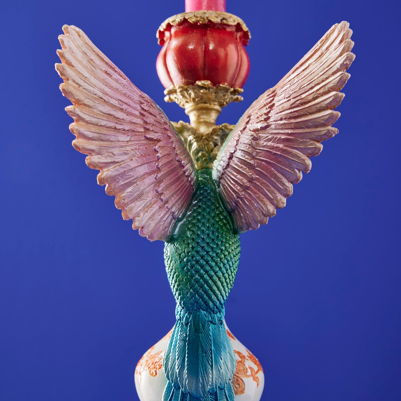 Dekorativ ljusstake med fantasifull karaktär. Den detaljrika kolibrin sveper elegant runt den ornamenterade foten och skapar ett uttryck som känns både levande och sofistikerat. Med skimrande toner i grönt, turkost och mjukt rosa, tillsammans med gyllene detaljer och klassiska mönster, blir denna ljusstake en verklig blickfångare i hemmet.