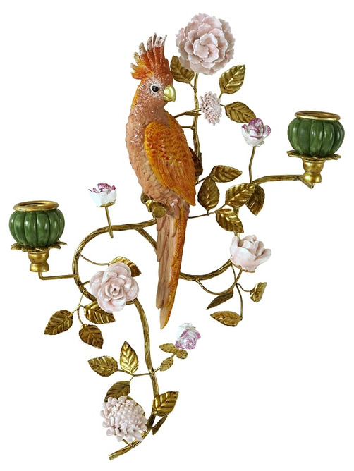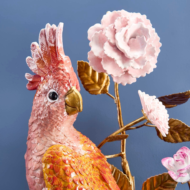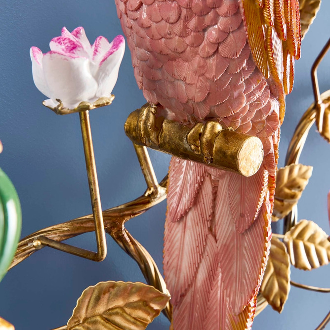 En riktig statement-pjäs för väggen. Den här dekorativa väggljusstaken kombinerar romantiska rosor, gyllene blad och en ståtlig rosa kakadua som stolt vakar över rummet. Kombinationen av mjuka pasteller och antikguldfärgade detaljer skapar en uttrycksfull och elegant känsla med en lekfull twist.