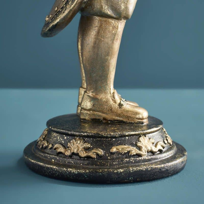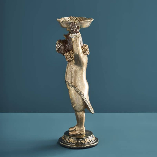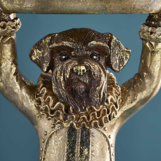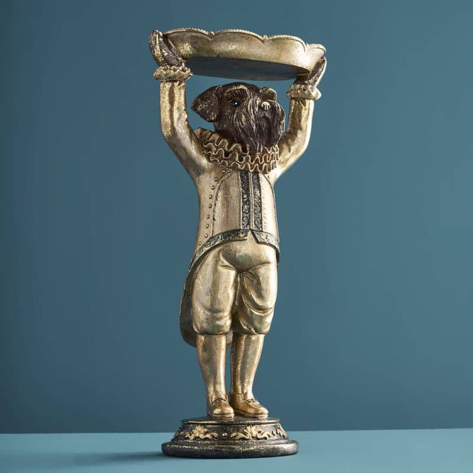 Den här stiliga hunden tar servering till en helt ny nivå – med högburet fat, kunglig hållning och en look som känns hämtad från ett slott (eller åtminstone en väldigt snygg hall). Med sin antikguldiga finish, detaljerade kläder och charmiga uttryck blir den en riktig blickfångare i rummet.
