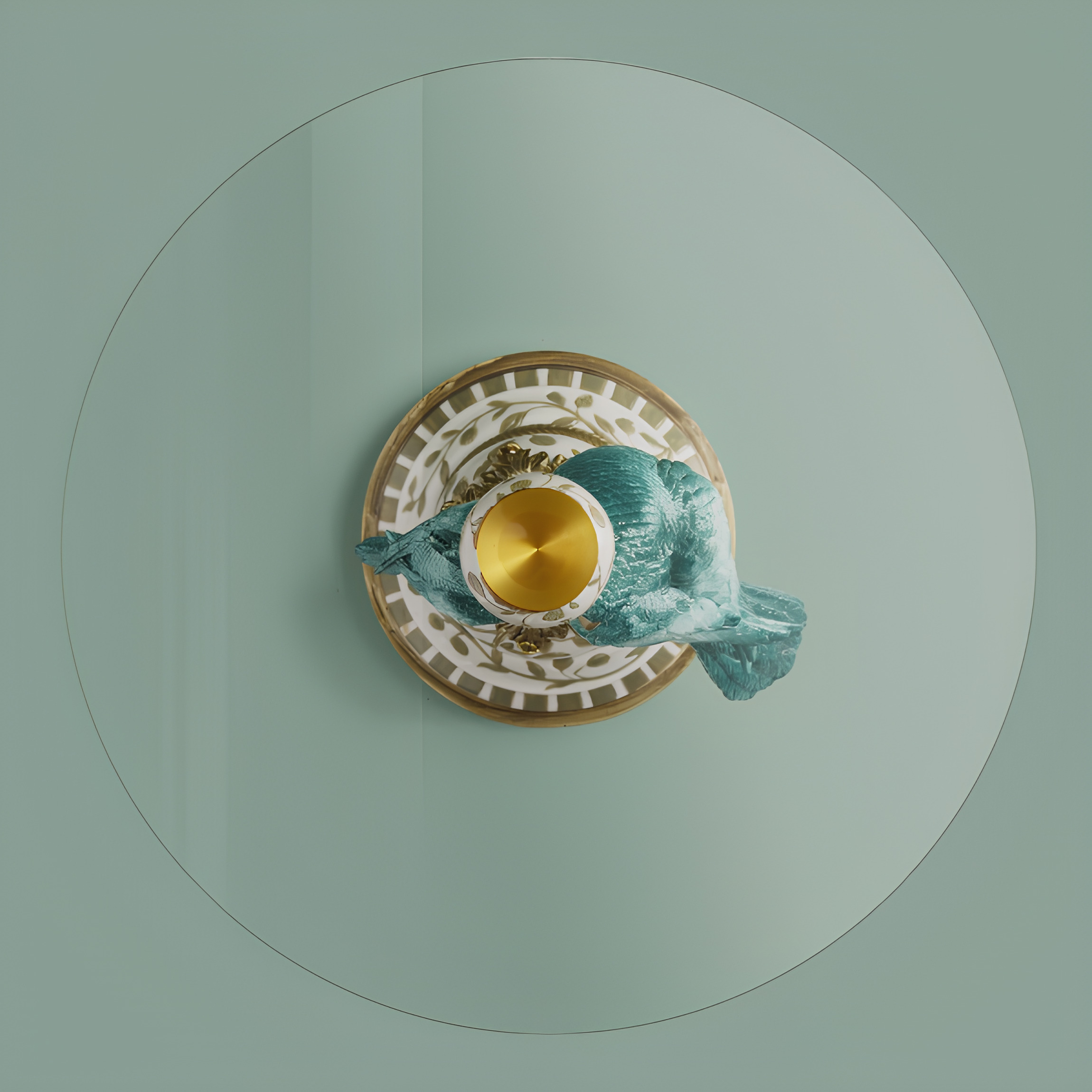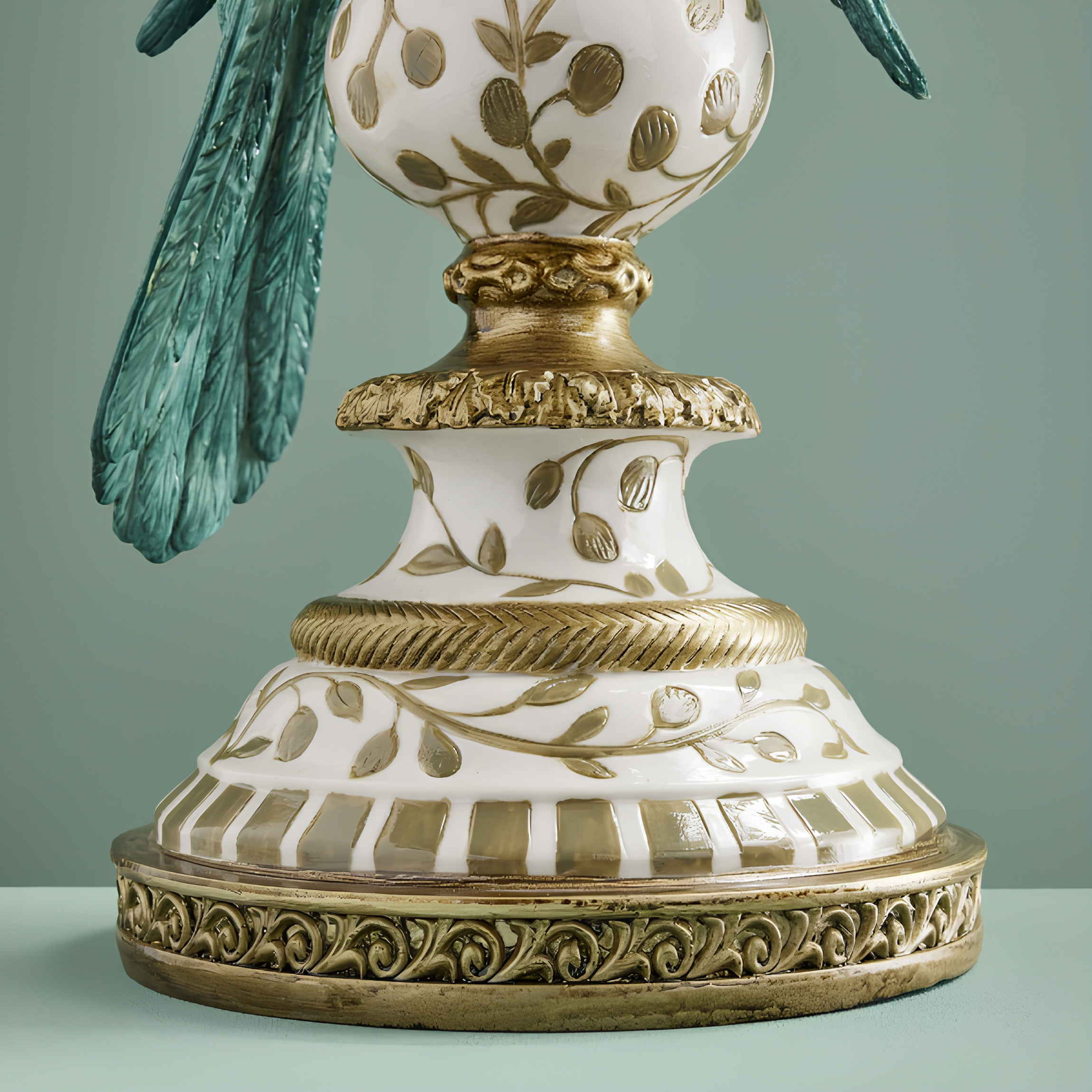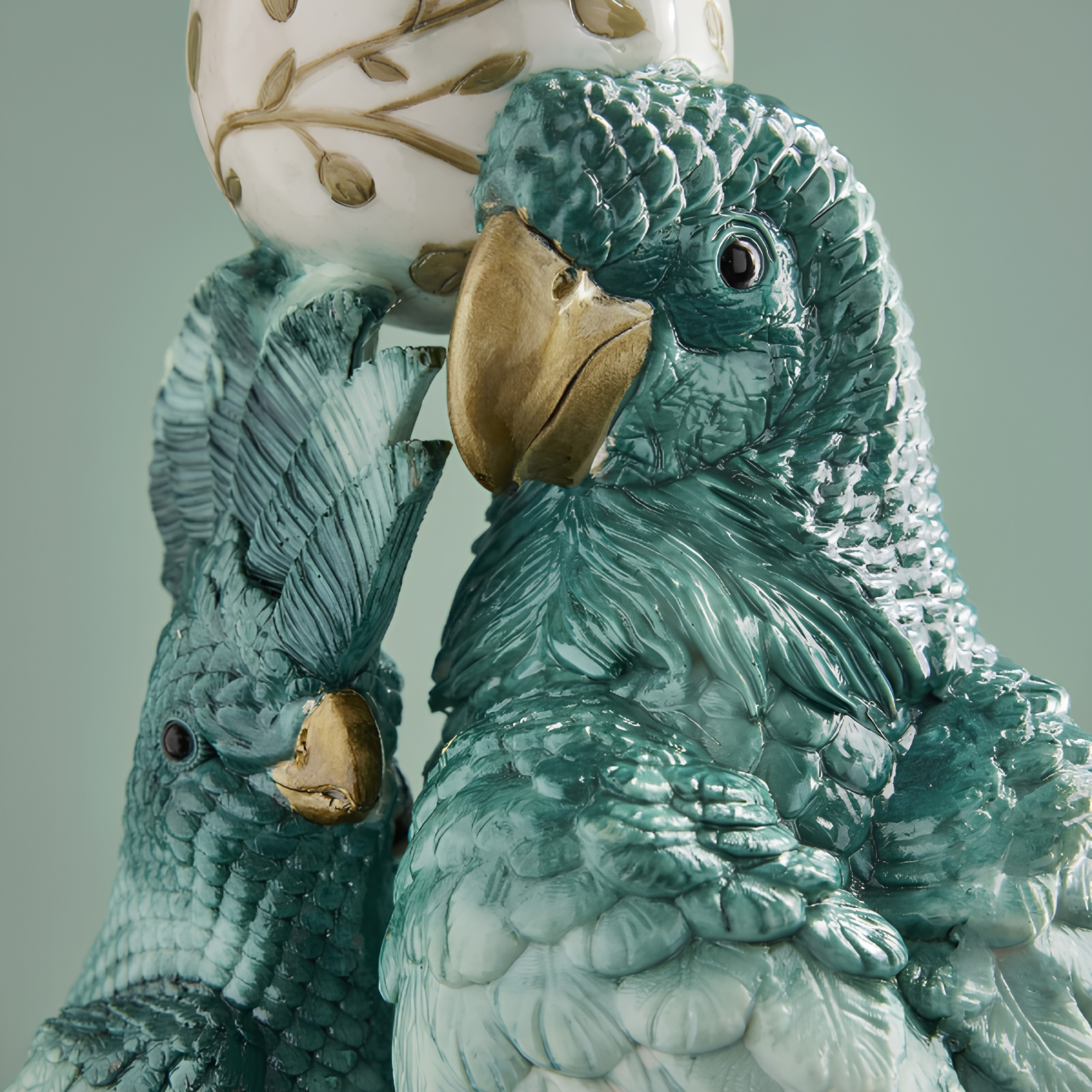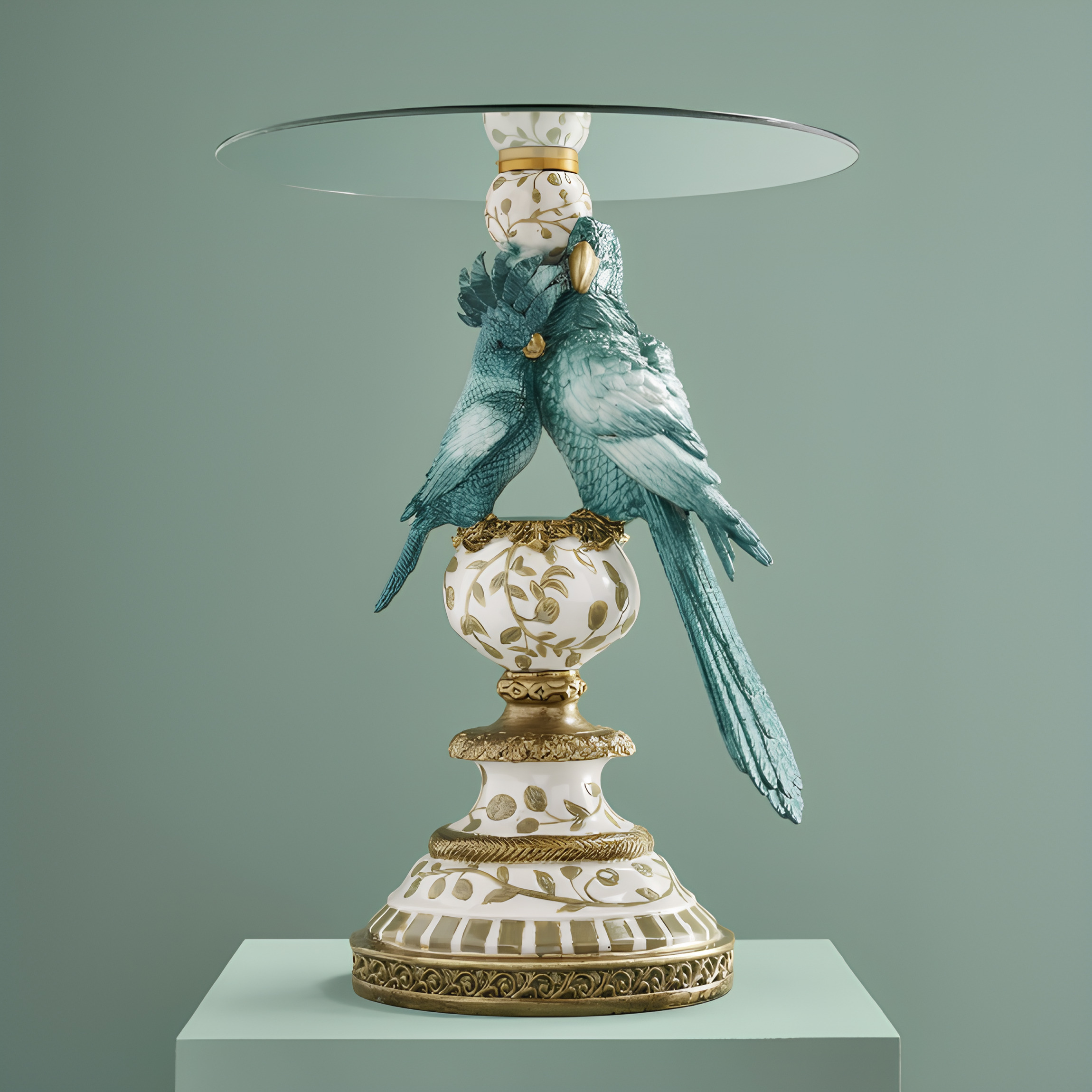 Låt inredningen få ta plats med detta unika sidobord som kombinerar funktion med ren konstkänsla. De detaljrika papegojorna i vackra turkosa toner bär upp den eleganta glasskivan och skapar ett uttryck som känns både exklusivt, lekfullt och sofistikerat. Den dekorativa foten med sina vackra mönster och gyllene detaljer förstärker bordets lyxiga karaktär och gör det till ett verkligt blickfång i rummet.