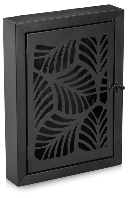 Nyckelskåp i svart metall som kombinerar praktisk förvaring med en dekorativ front i elegant blad-mönster. Inuti finns 6 krokar, perfekt för familjens nycklar, extranycklar eller bilnycklar.